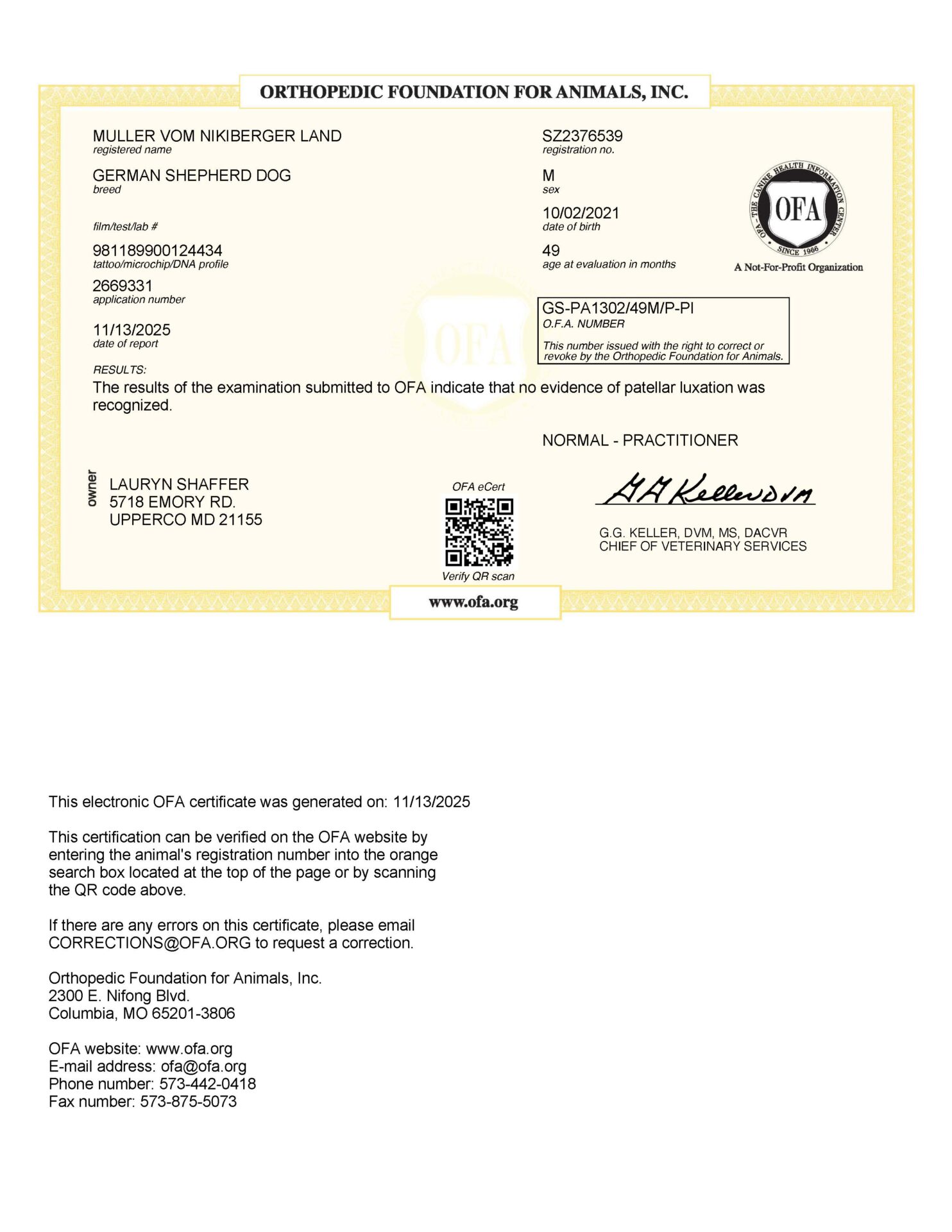 All health testing is fully documented with the German SV and OFA (Orthopedic Foundation for Animals).