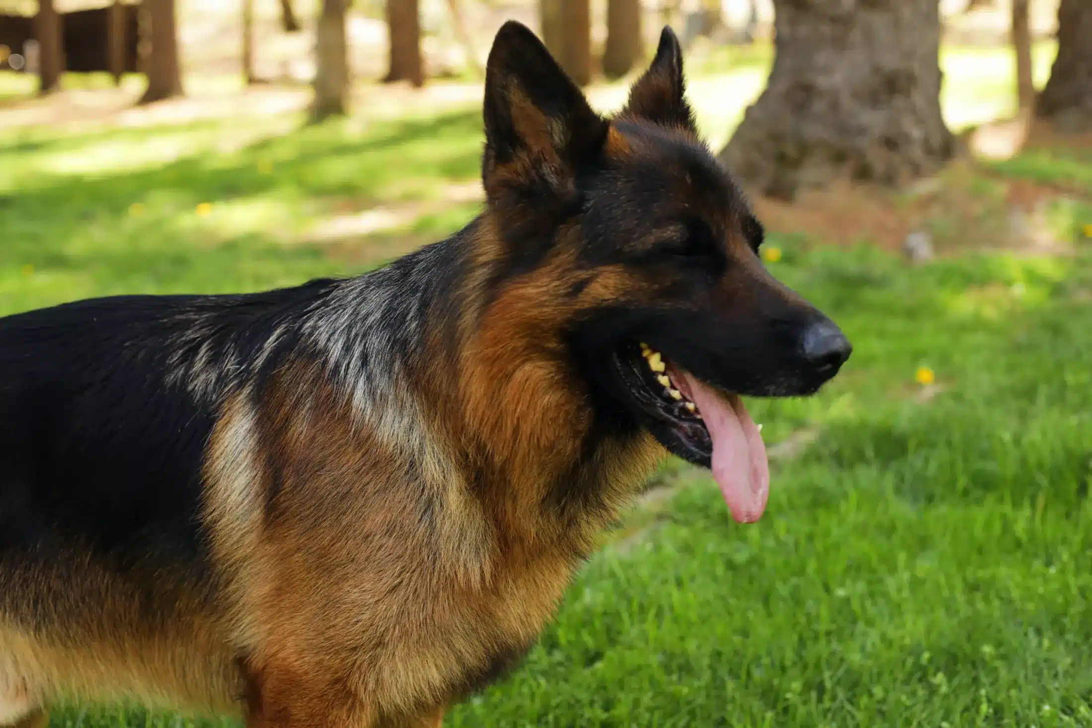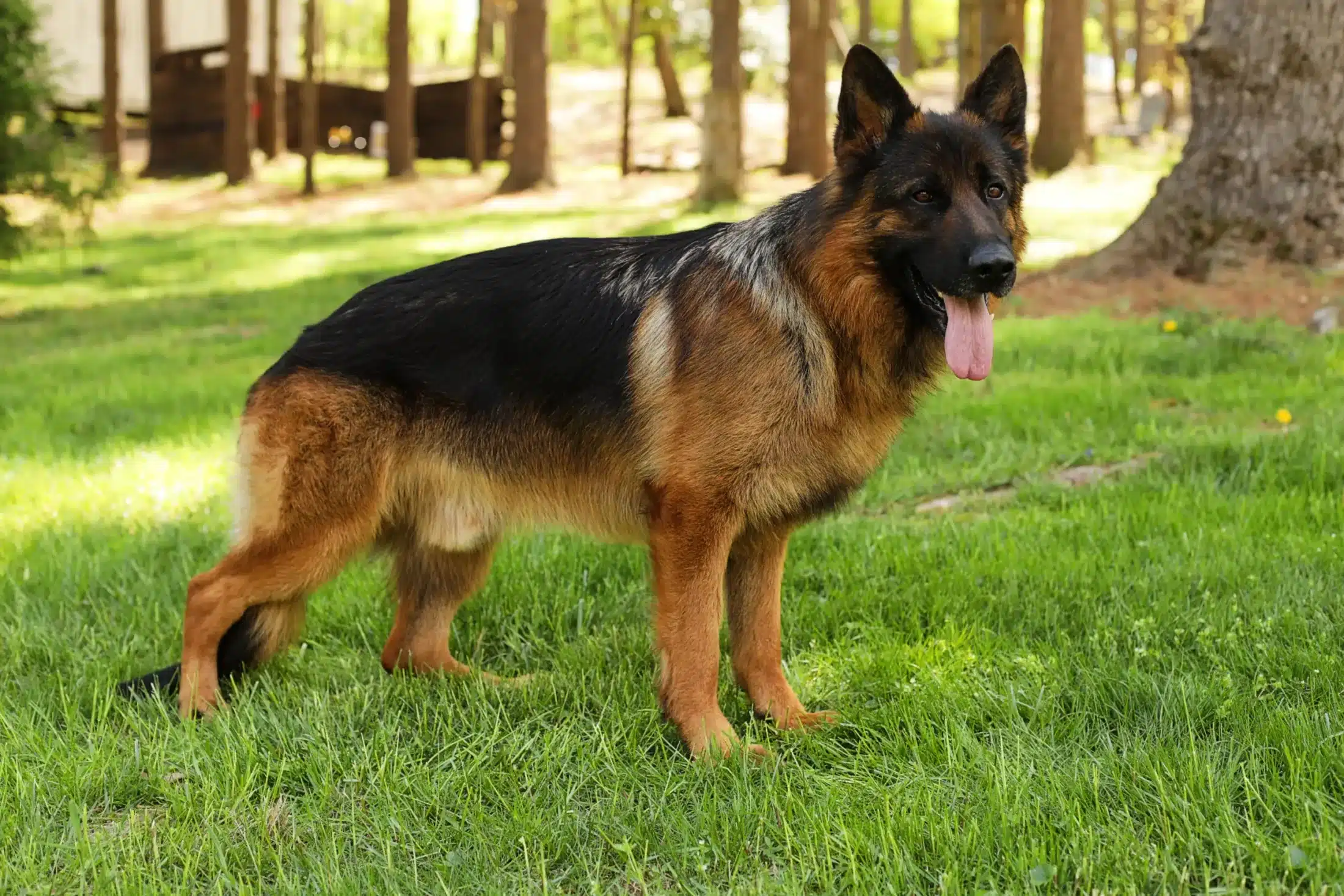 Yupp exhibits a large, powerful, and well-proportioned build. His coat is dry and firm, showcasing expressive characteristics, while the coloration features excellent pigmentation with a significant amount of black. The overall conformation is very good, highlighting a strong and expressive head with an excellent mask. The body lines are attractive, with good front and rear angulation, allowing for impressive movement characterized by a powerful rear and effective forward approach.
