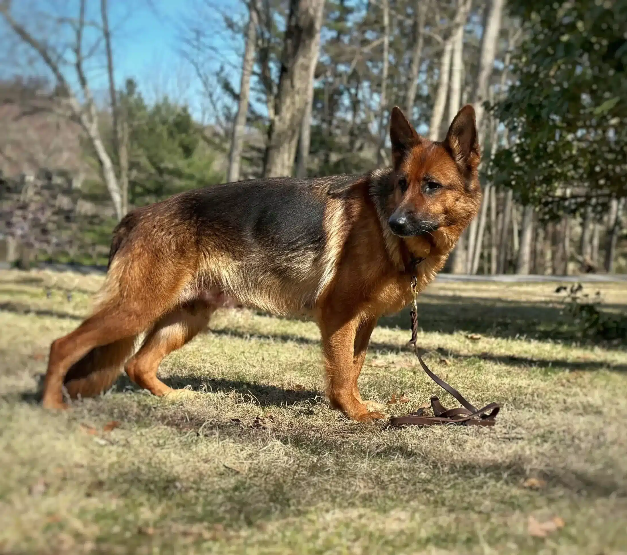 Amoji’s coat gleams with an intensity that catches the eye, a testament to the quality of her lineage. With a sturdy frame and an alert posture, she exudes both power and elegance.Her stunning face with deep rich red pigmentation in addition with her movements that are fluid and confident, reflecting the careful breeding and nurturing environment that have shaped her into such a remarkable German Shepherd. She is always abundantly focused and mannerisms held to perfection levels. She is one of the sweetest but one of my favorites for protection.(Have no fear when Amoji is near.) She does everything with purpose and poise. Her confidence eludes in any situation and noting short of great pride for her greatness.Her unwavering dedication to her role as a protector makes her an invaluable member of any family. Amoji’s keen instincts and alert nature ensure that she is always aware of her surroundings, ready to step in and provide comfort or security when needed. Her loyalty knows no bounds, and her affectionate nature creates a deep bond with those she loves. Beyond her protective qualities, Amoji’s playful side shines through in her interactions. Whether she’s engaging in a friendly game of fetch or exploring new trails, her energy is infectious and brings joy to those around her. Her intelligence and eagerness to learn make training sessions both enjoyable and rewarding, as she quickly masters new commands and skills. In essence, Amoji embodies the perfect balance of strength, grace, and warmth. Her presence is not only reassuring but also enriching, making her a cherished companion who brings out the best in everyone she meets. Families seeking a devoted and loving addition will find a true treasure in Amoji, whose heart is as vast as her capabilities.